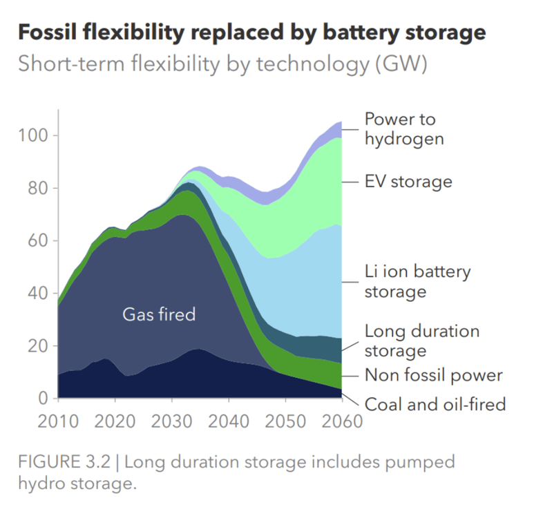 未来几十年,随着长时储能容量投入使用,以及独立锂离子电池储能和车网互动储能增加,锂离子电池储能的占比将下降,到2060年,其总占比将达到45%。